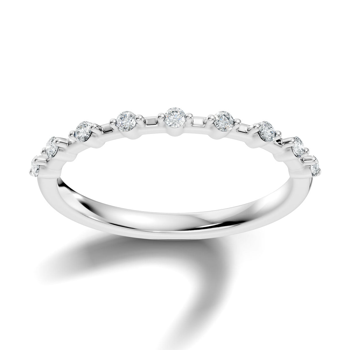 טבעת יהלומים עדינה ויוקרתית בעיצוב חצי נצח, משובצת בשורת יהלומים עגולים זוהרים לכל אורך החלק העליון של הזרוע. השיבוץ המדורג יוצר משחק של אור ונצנוץ מכל זווית, ומעניק לטבעת מראה קלאסי על-זמני שמתאים לענידה לבד או בשילוב עם טבעות נוספות.