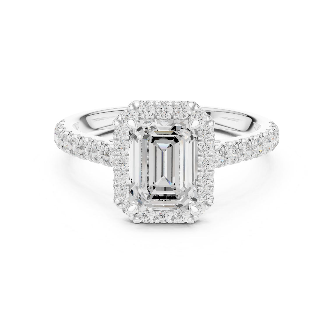 טבעת יהלום מרהיבה בעיצוב הלו סביב יהלום מרכזי בחיתוך אמרלד. היהלום המרכזי מתאפיין בקווים גיאומטריים חדים ובברק ייחודי, ומוקף בעדינות בשורת יהלומים קטנים המקיפים אותו מכל צד ומעצימים את הניצוץ. הזרוע הדקה והמעוטרת משלימה את המראה היוקרתי והאלגנטי, ליצירת טבעת על-זמנית מלאת עוצמה ונוכחות.