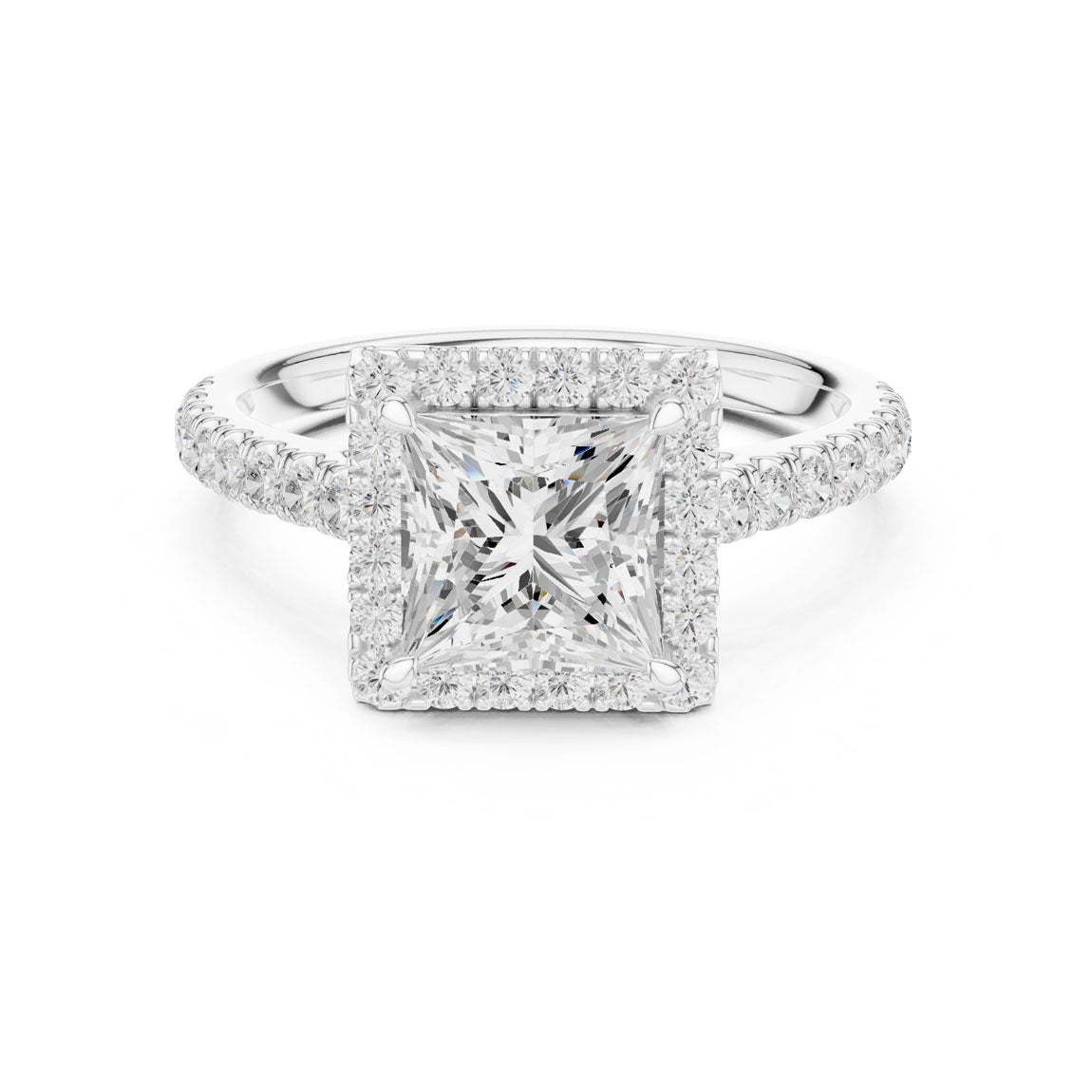 טבעת יהלום מרהיבה בעיצוב הלו סביב יהלום מרכזי בחיתוך פרינסס. היהלום המרכזי מתאפיין בקווים גיאומטריים חדים ובברק ייחודי, ומוקף בעדינות בשורת יהלומים קטנים המקיפים אותו מכל צד ומעצימים את הניצוץ. הזרוע הדקה והמעוטרת משלימה את המראה היוקרתי והאלגנטי, ליצירת טבעת על-זמנית מלאת עוצמה ונוכחות.