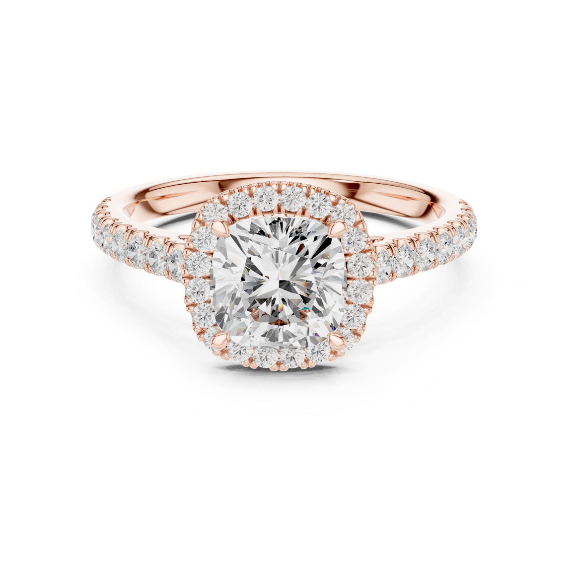 טבעת יהלום מרהיבה בעיצוב הלו סביב יהלום מרכזי בחיתוך אשר. היהלום המרכזי מתאפיין בקווים גיאומטריים חדים ובברק ייחודי, ומוקף בעדינות בשורת יהלומים קטנים המקיפים אותו מכל צד ומעצימים את הניצוץ. הזרוע הדקה והמעוטרת משלימה את המראה היוקרתי והאלגנטי, ליצירת טבעת על-זמנית מלאת עוצמה ונוכחות.
