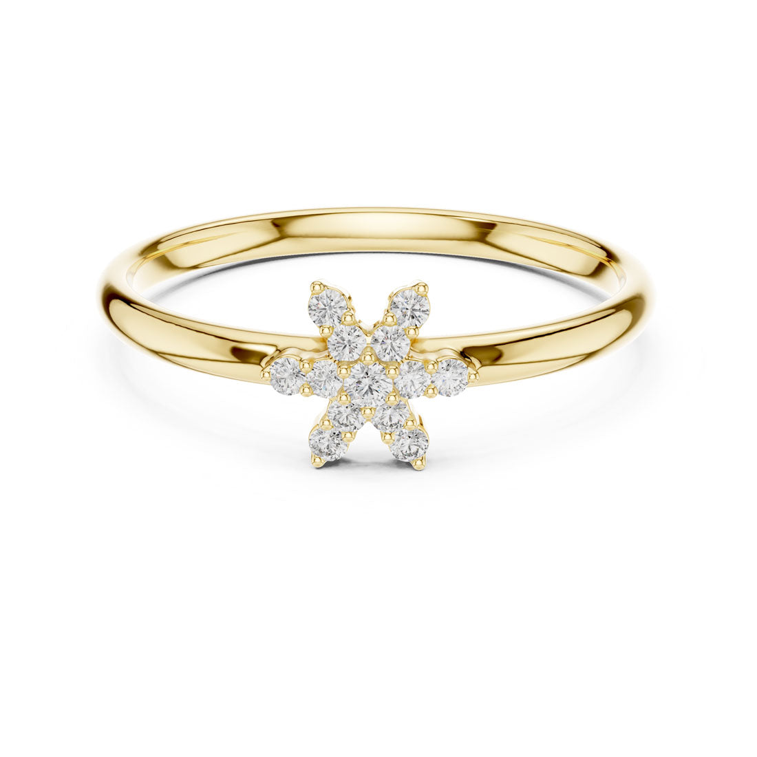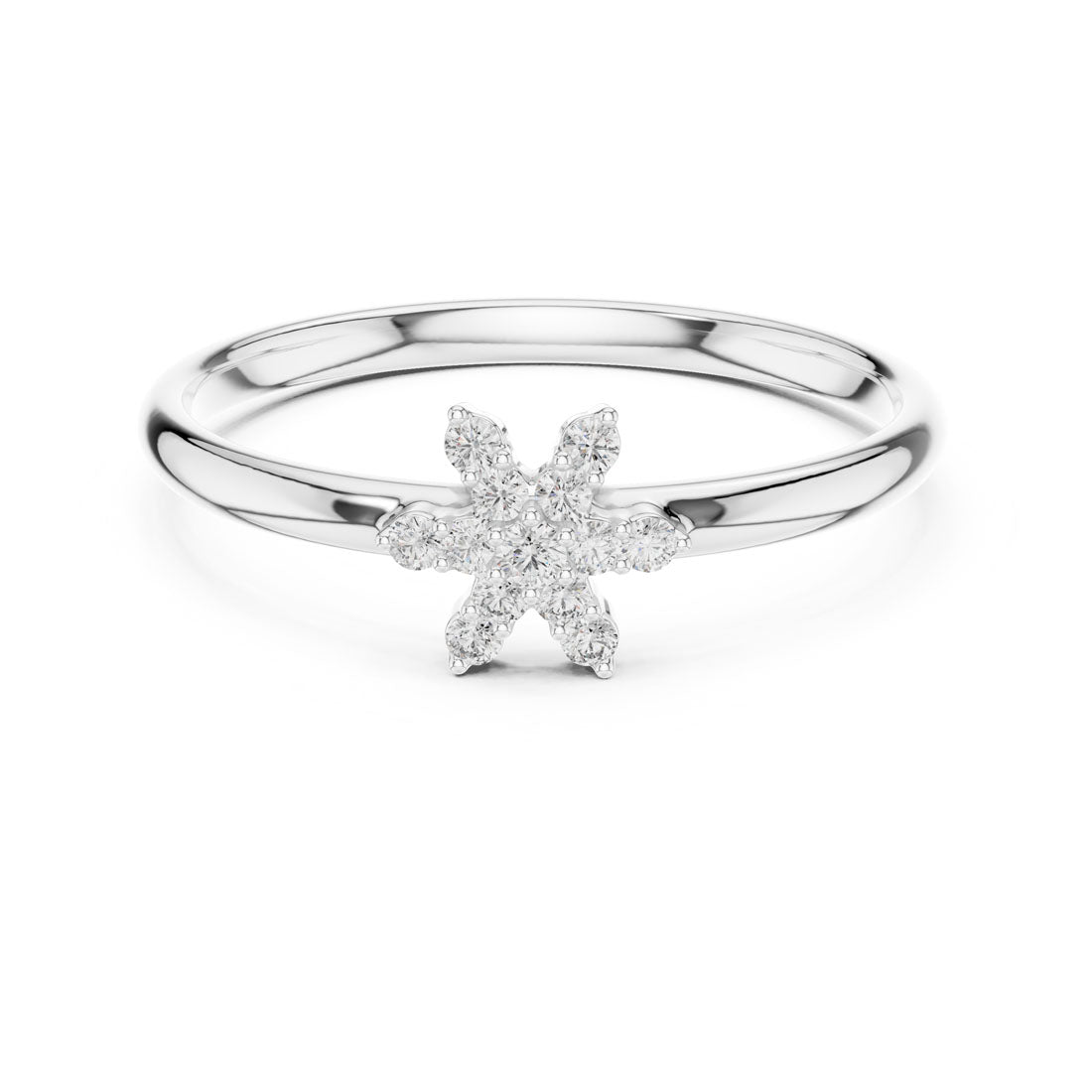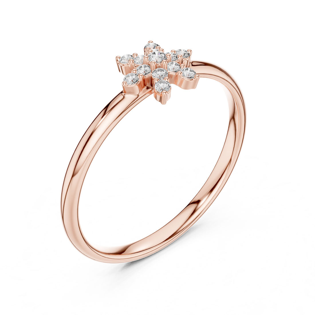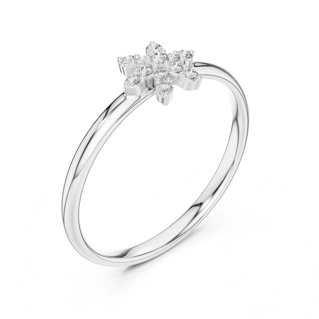 טבעת פרח עדינה בעיצוב שישה עלי כותרת משובצים יהלומים טבעיים נוצצים. השיבוץ המדויק יוצר מראה זוהר ומיוחד שמושך את העין. טבעת קלאסית עם נגיעה רומנטית שמתאימה לכל אירוע.