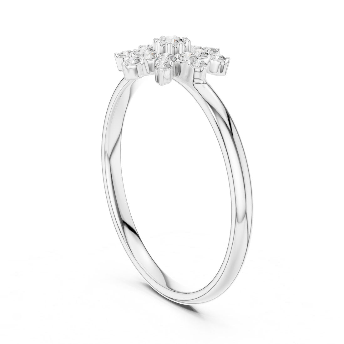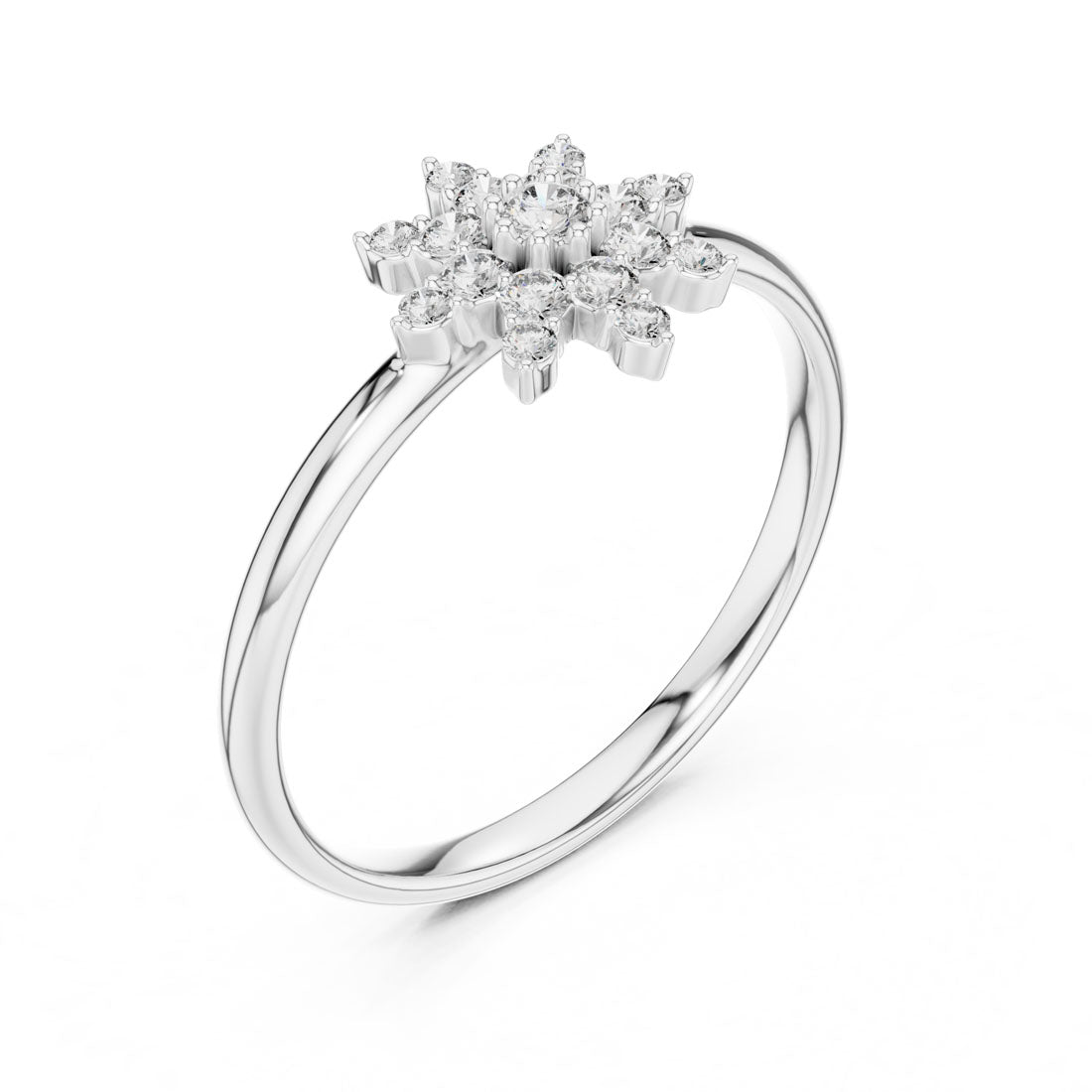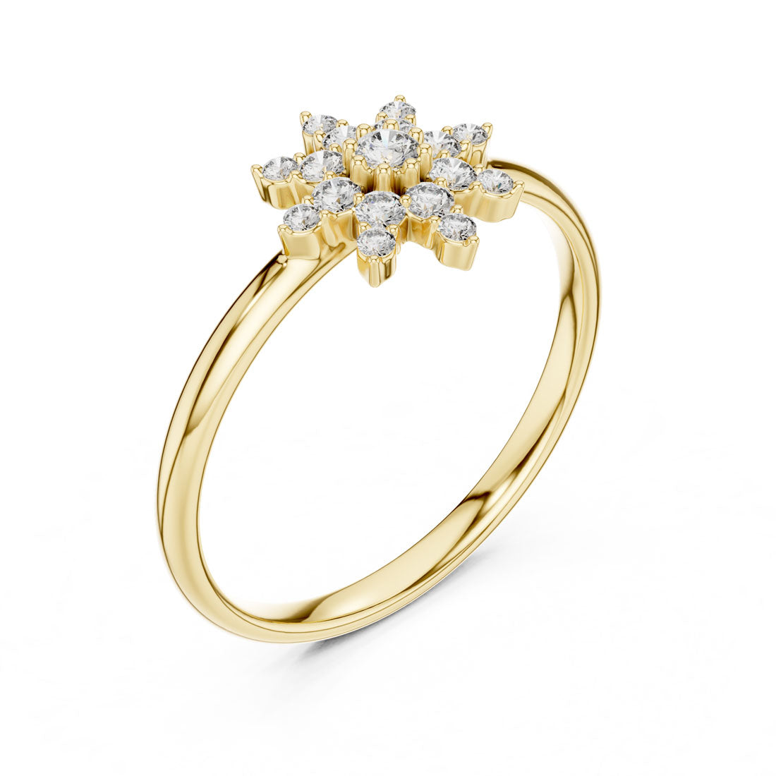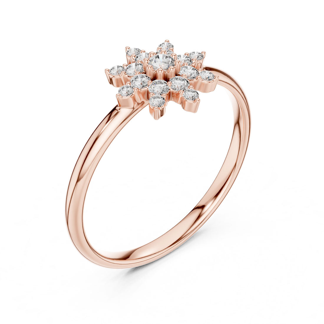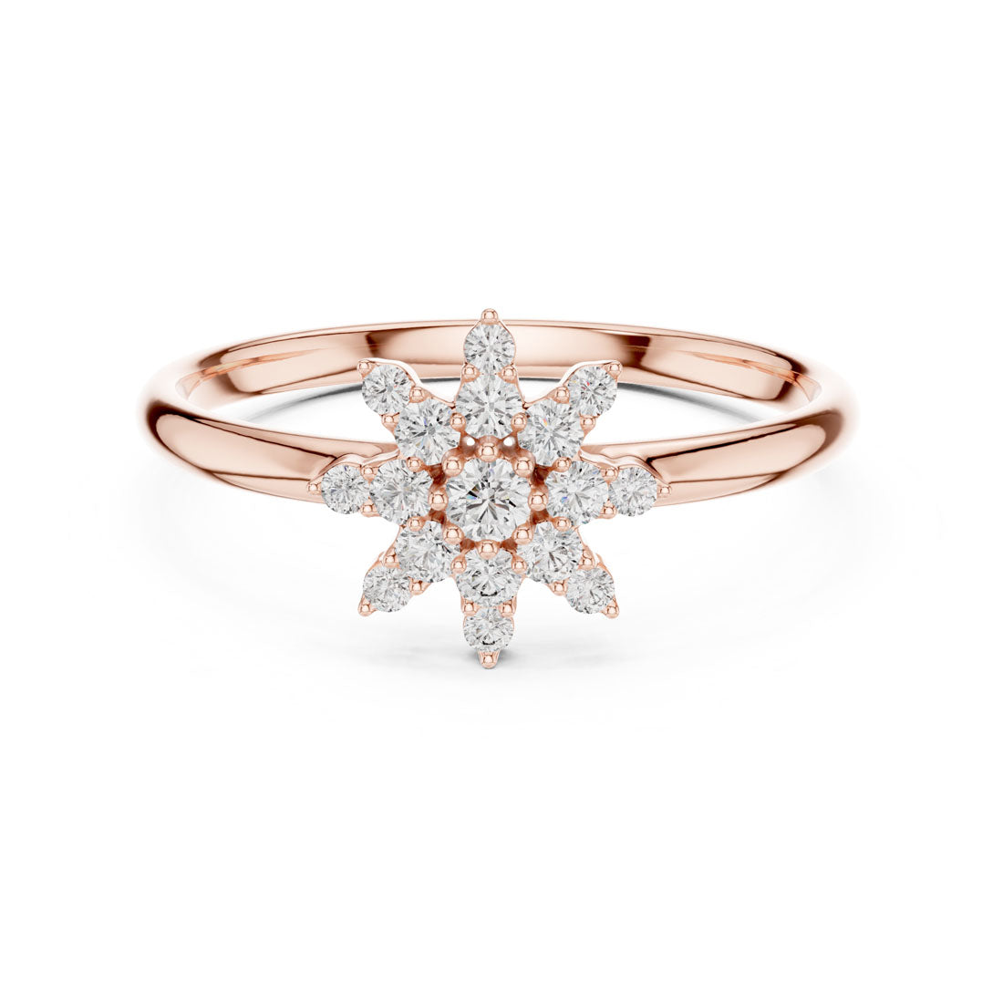 טבעת מעוצבת בסגנון פרח יוקרתי השואבת השראה מהטבע ומביאה אלגנטיות זוהרת לכל מראה. במרכז הטבעת ניצב יהלום בוהק וסביבו שמונה עלי כותרת משובצים יהלומים נוצצים, יחד יוצרים מראה מרשים מלא אור ותנועה.