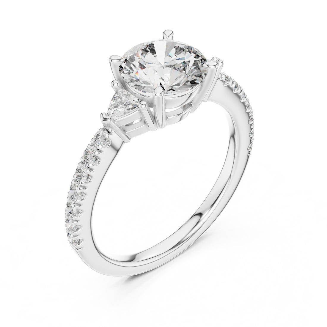 טבעת סוליטר מרהיבה בעיצוב עשיר ואלגנטי, משובצת יהלום מרכזי עגול בליווי יהלומים משולשים משני צדדיו, ושיבוץ צדדי לאורכה. שילוב של איזון ועוצמה ויזואלית באיכות גבוהה של זהב ויהלומים.