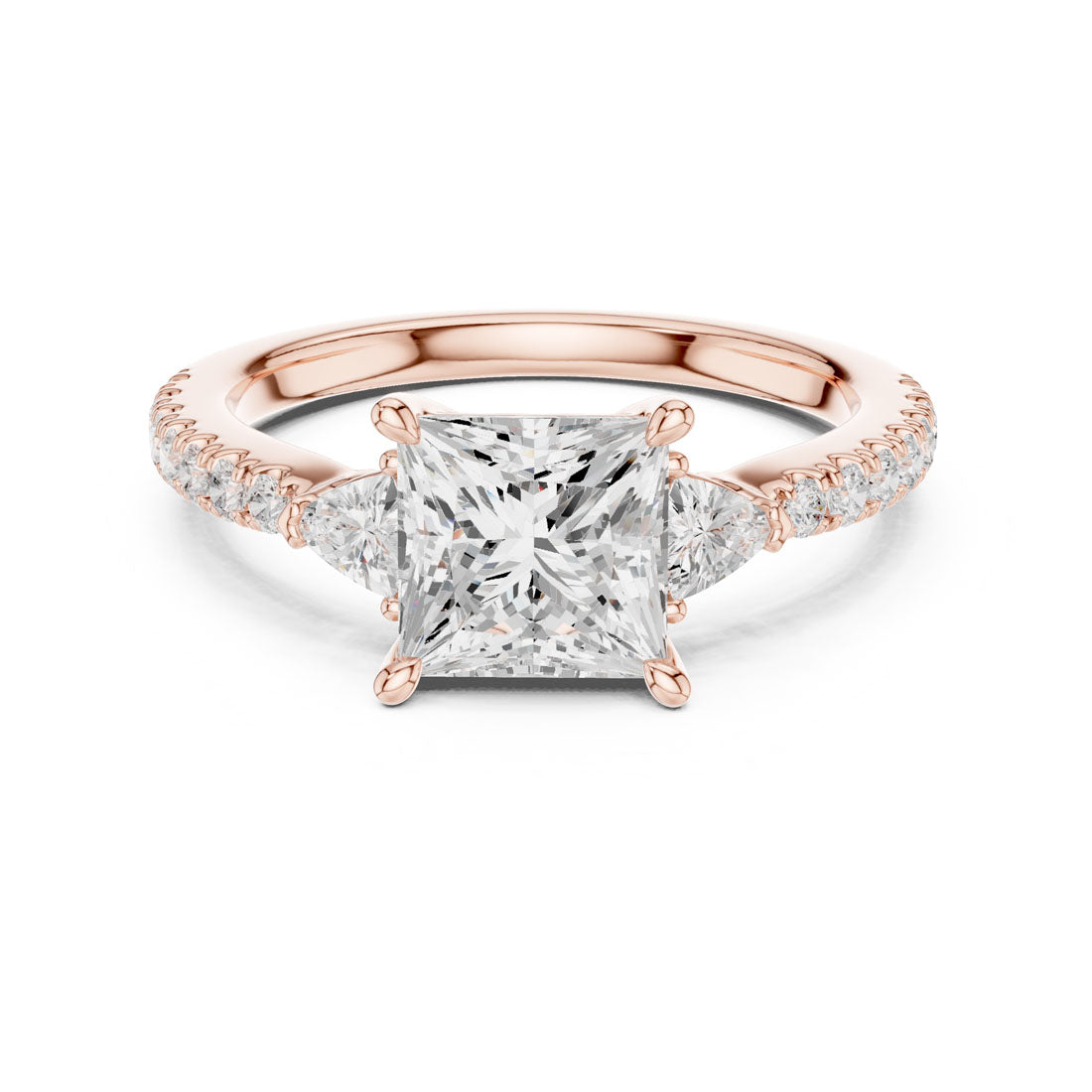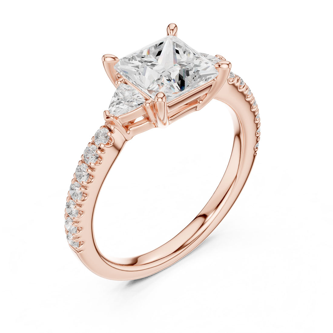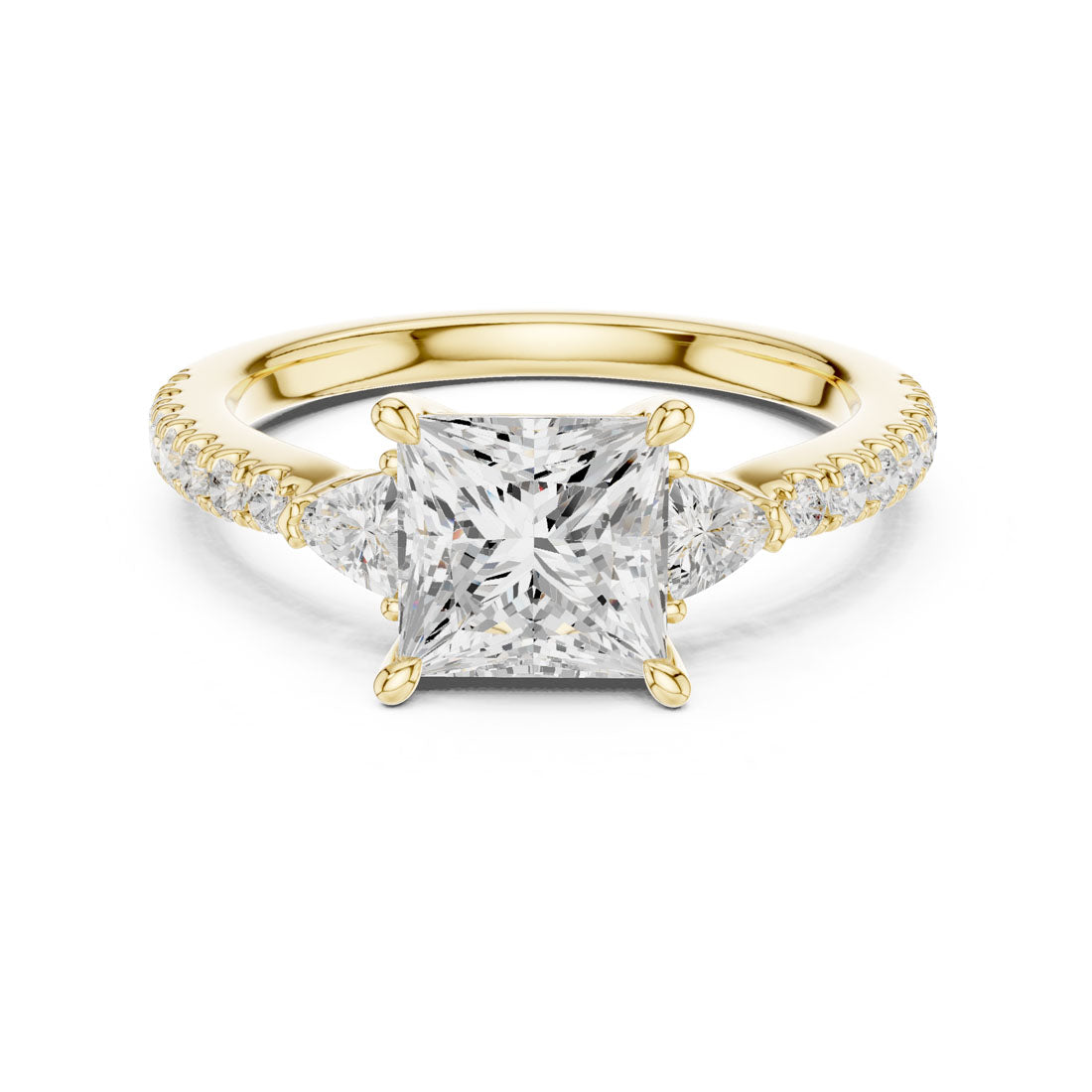 טבעת מרהיבה עם יהלום מרכזי בליטוש פרינסס קאט במשקל 1.50 קראט, בעיצוב עכשווי ונקי. משני צדדיו שובצו יהלומי טריליון במשקל 0.10 קראט כל אחד, להבלטת הצורה הגאומטרית של המרכז. זרוע הטבעת מעוטרת ביהלומים קטנים להשלמת המראה המוקפד. משקל כולל 2.00 קראט. שילוב של עיצוב חד ויוקרה מרוכזת