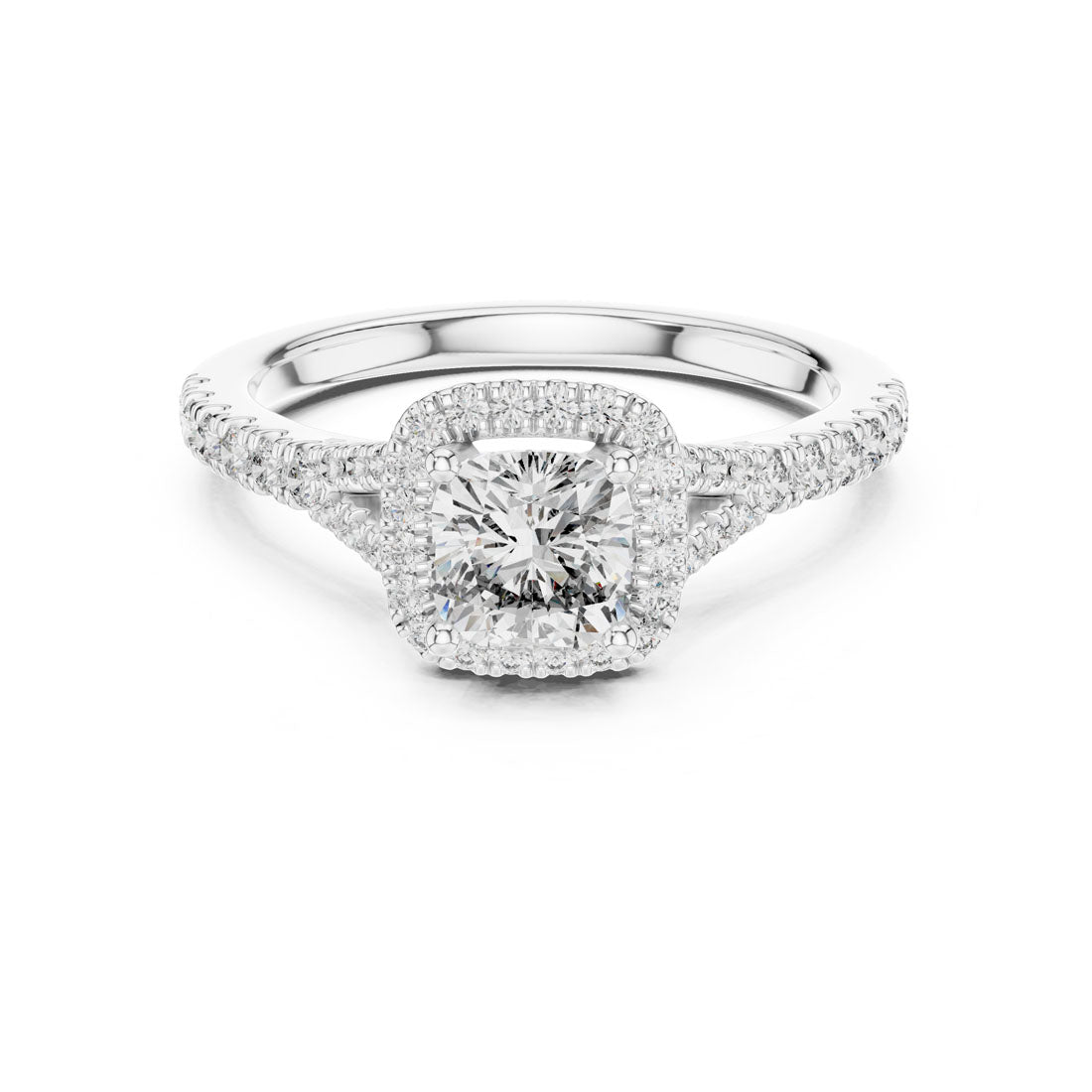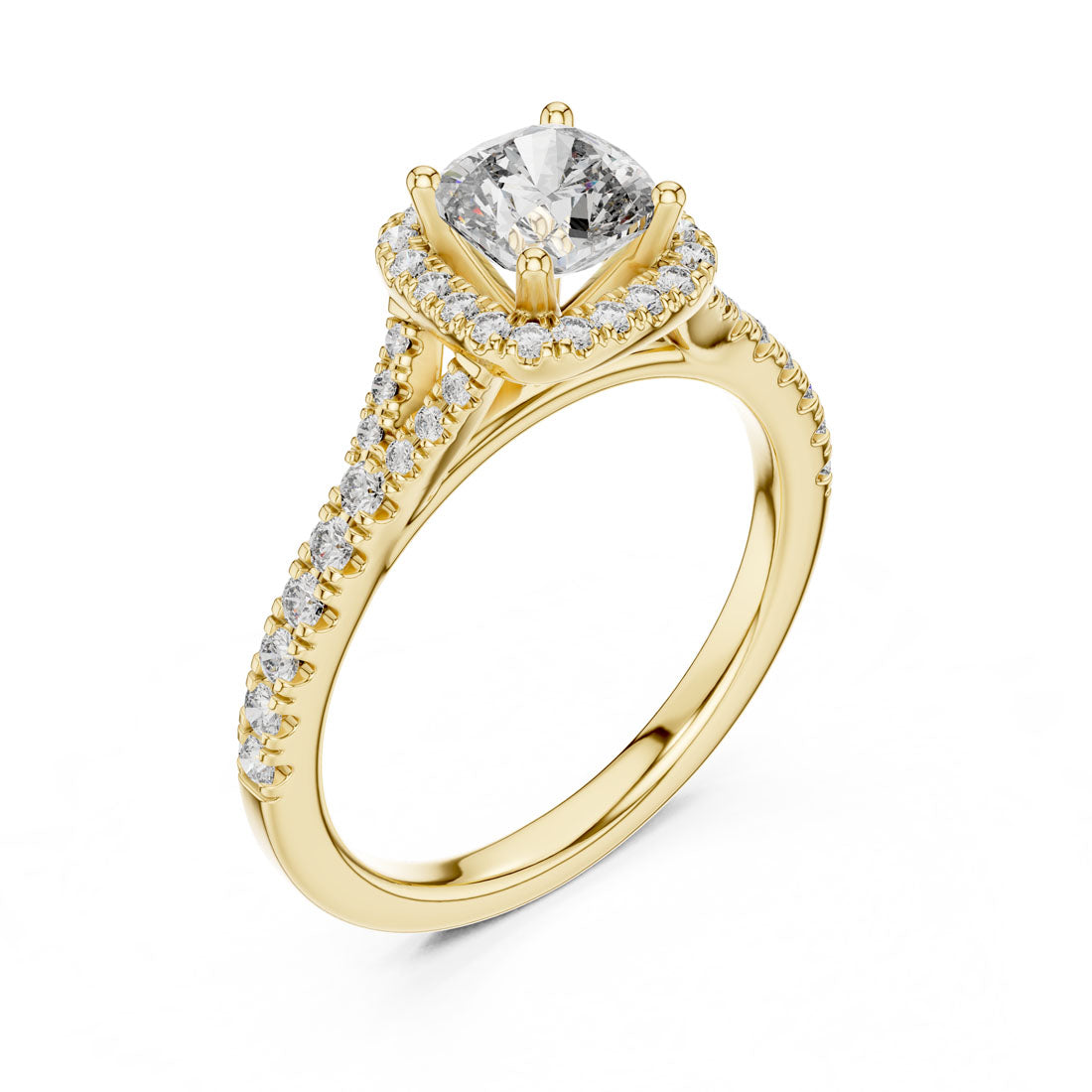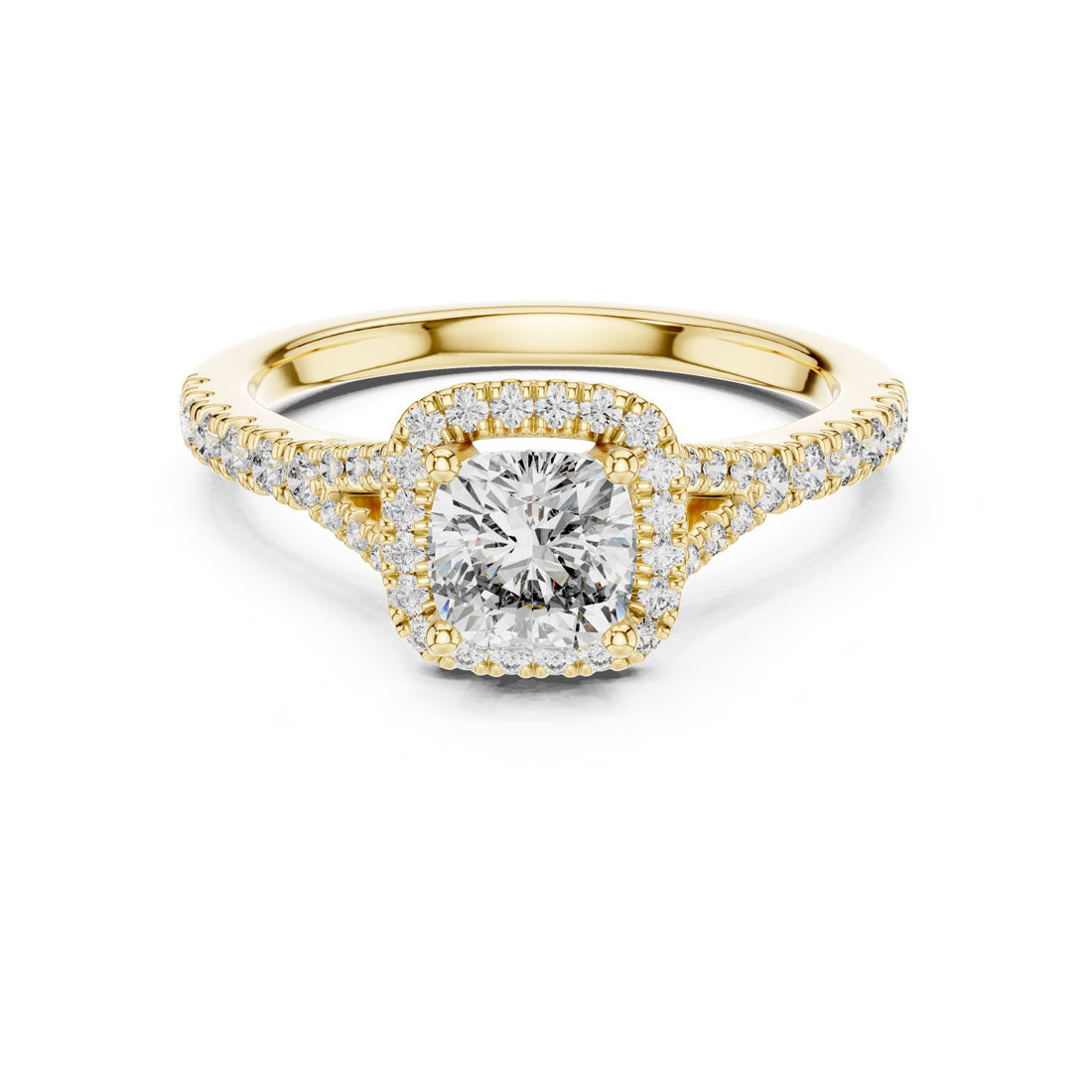 טבעת יוקרתית בזהב 14 קראט עם יהלום מרכזי בליטוש קושן, משובץ במסגרת הילה נוצצת המבליטה את הברק של האבן המרכזית. שיבוץ יהלומים נוספים על גבי הזרועות מעניק מראה אלגנטי, קלאסי ונשי. עיצוב שמחבר בין מסורת יוקרתית לנגיעה עכשווית
