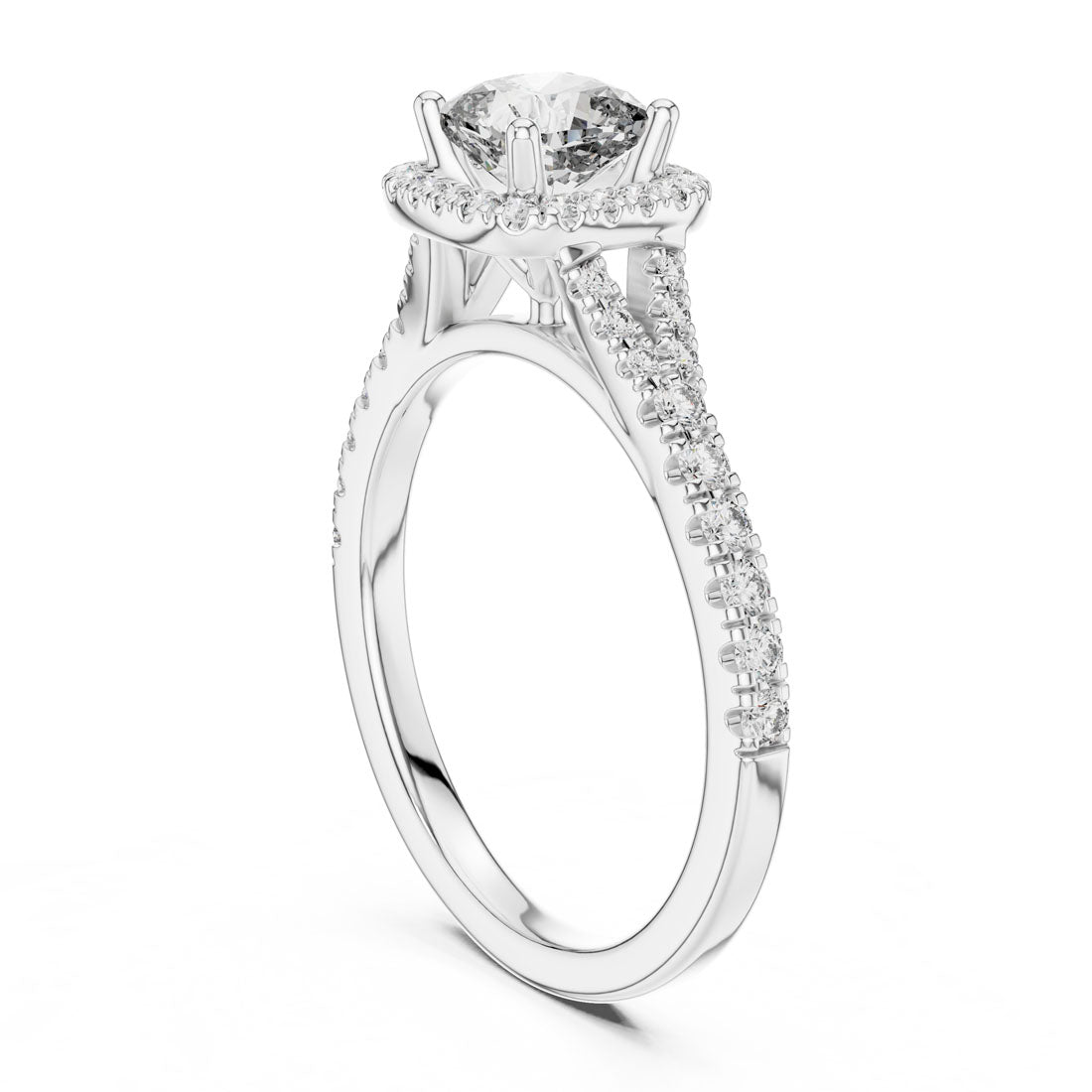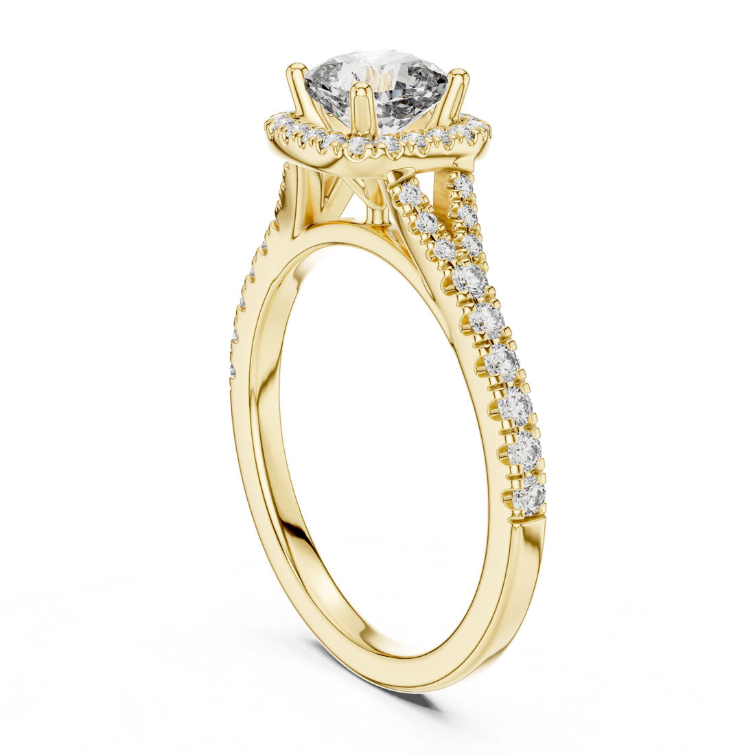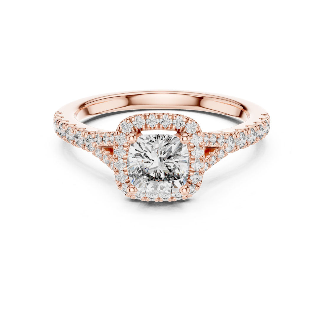 טבעת יוקרתית בזהב 14 קראט עם יהלום מרכזי בליטוש קושן, משובץ במסגרת הילה נוצצת המבליטה את הברק של האבן המרכזית. שיבוץ יהלומים נוספים על גבי הזרועות מעניק מראה אלגנטי, קלאסי ונשי. עיצוב שמחבר בין מסורת יוקרתית לנגיעה עכשווית