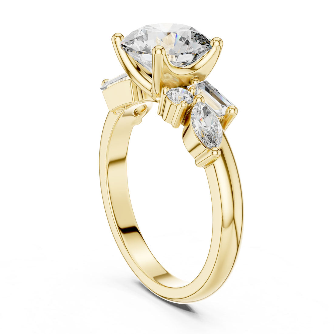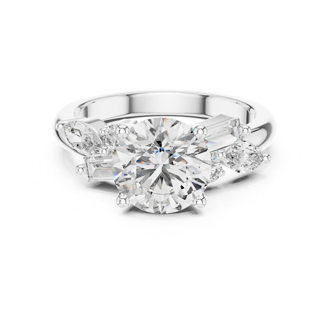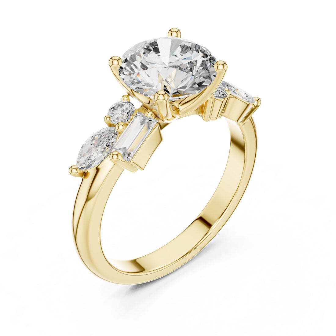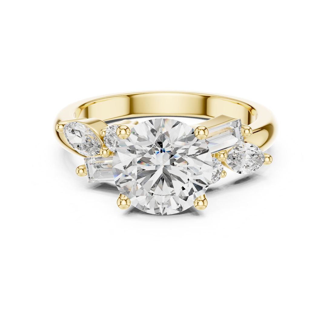 טבעת מרהיבה עם יהלום עגול טבעי במרכז, מוקף בעיצוב אומנותי של יהלומי באגט, מרקיזה ויהלומים עגולים בצדדים. השילוב בין הצורות מעניק תחושת זרימה, הרמוניה ותחכום, ומייצר נוכחות בולטת ומקורית על היד. עיצוב מושלם למי שמחפשת טבעת יוצאת דופן עם סגנון אישי