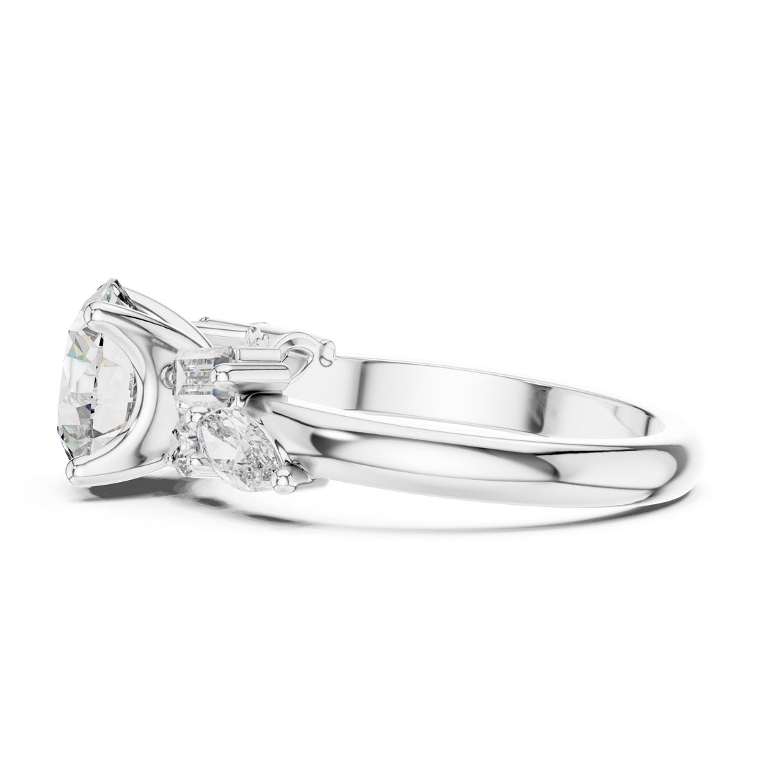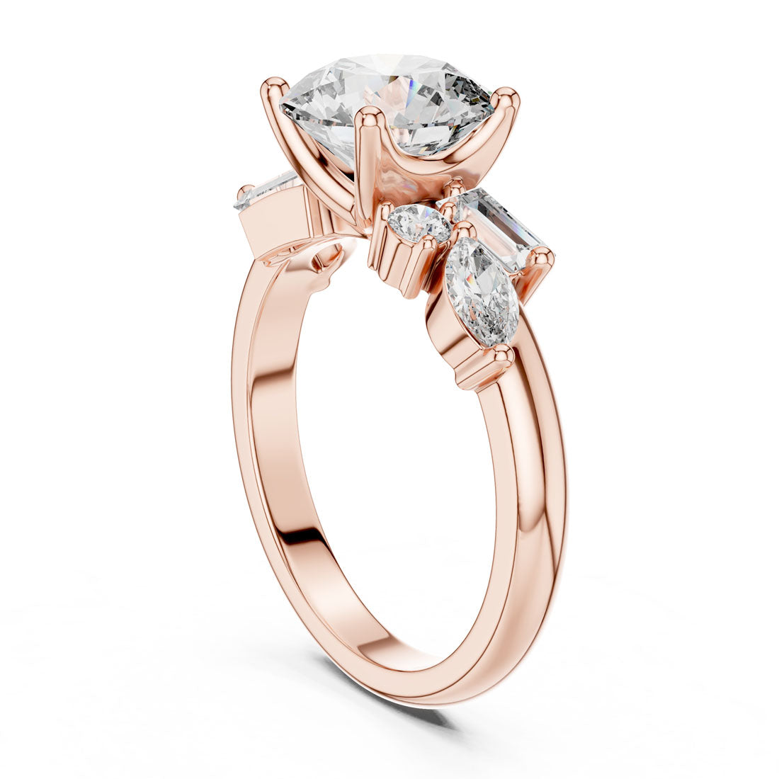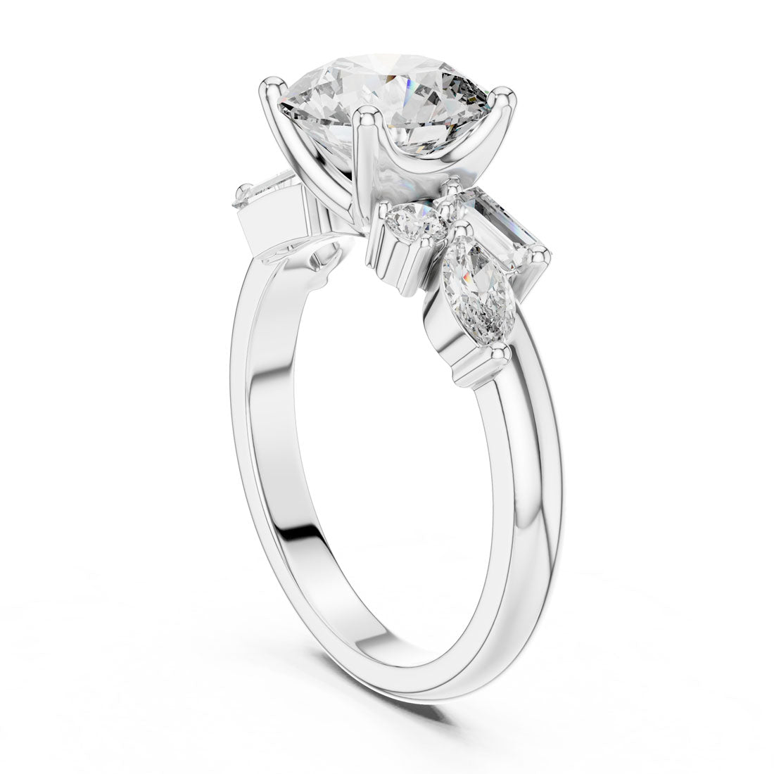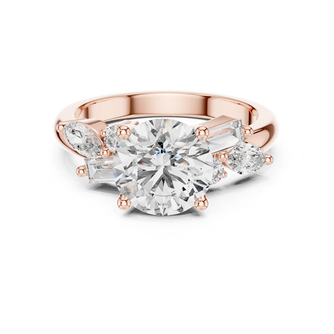 טבעת מרהיבה עם יהלום עגול טבעי במרכז, מוקף בעיצוב אומנותי של יהלומי באגט, מרקיזה ויהלומים עגולים בצדדים. השילוב בין הצורות מעניק תחושת זרימה, הרמוניה ותחכום, ומייצר נוכחות בולטת ומקורית על היד. עיצוב מושלם למי שמחפשת טבעת יוצאת דופן עם סגנון אישי