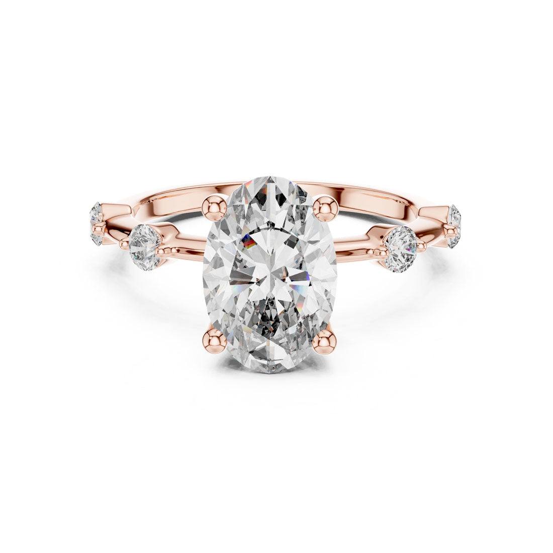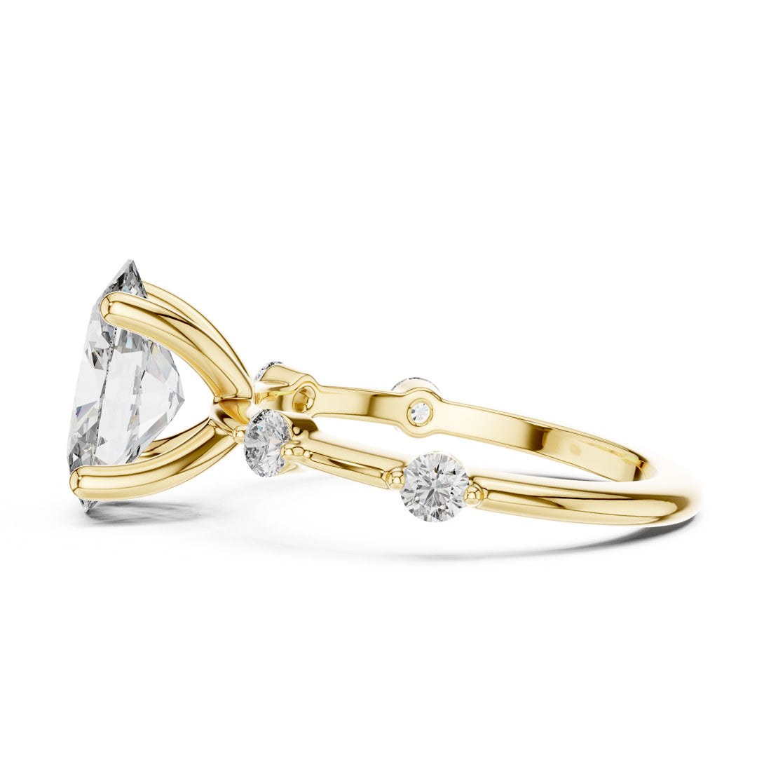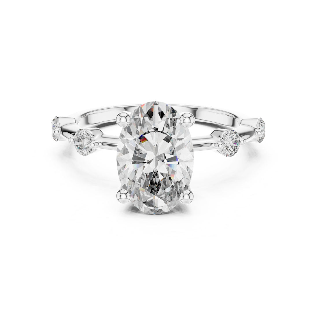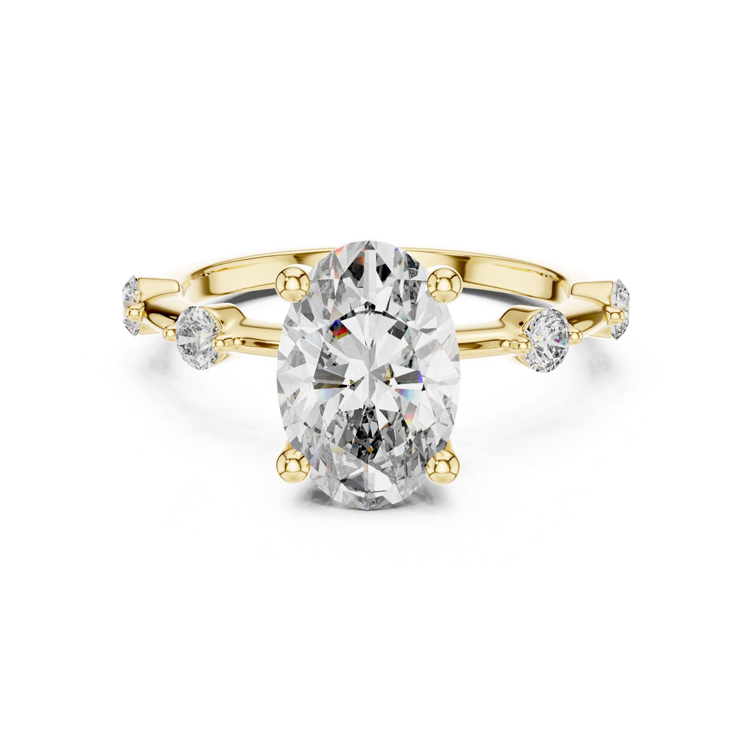 טבעת בעיצוב מרשים עם יהלום אובלי במרכז ושיבוץ יהלומים עגולים לאורכה של הזרוע. השילוב בין הצורה האליפטית לבין העדינות של היהלומים הצדדיים מעניק לטבעת מראה הרמוני, רך ומלא נוכחות. בחירה מושלמת למי שמחפשת תכשיט מעוצב עם אמירה אישית