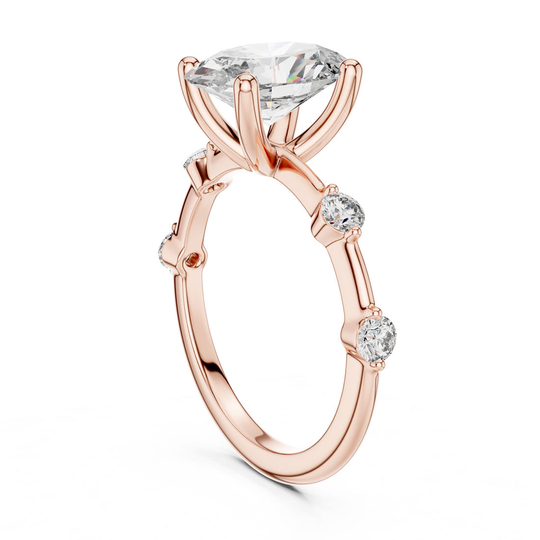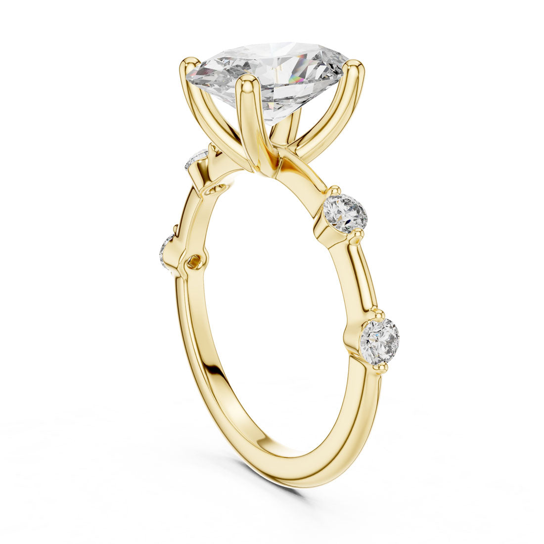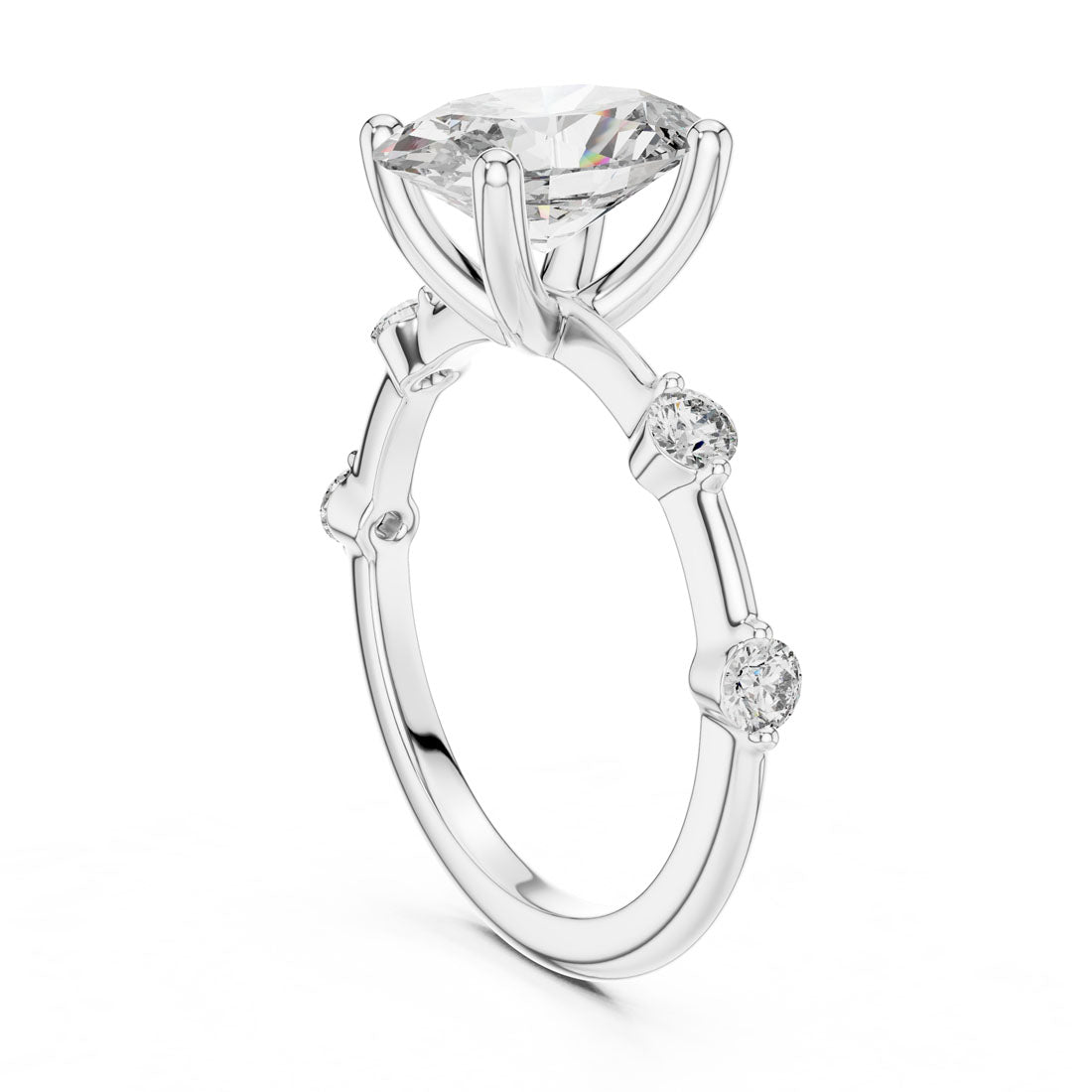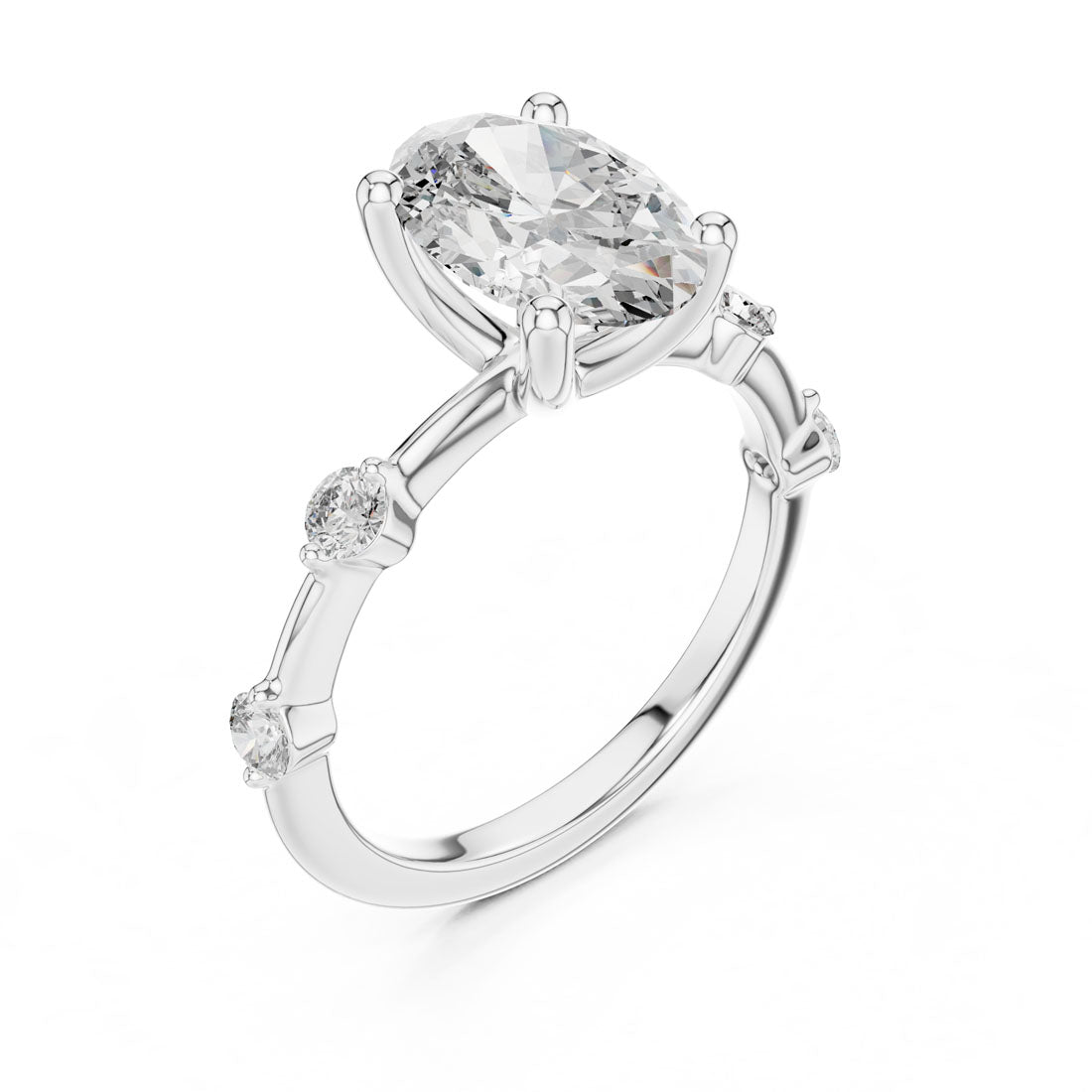 טבעת בעיצוב מרשים עם יהלום אובלי במרכז ושיבוץ יהלומים עגולים לאורכה של הזרוע. השילוב בין הצורה האליפטית לבין העדינות של היהלומים הצדדיים מעניק לטבעת מראה הרמוני, רך ומלא נוכחות. בחירה מושלמת למי שמחפשת תכשיט מעוצב עם אמירה אישית
