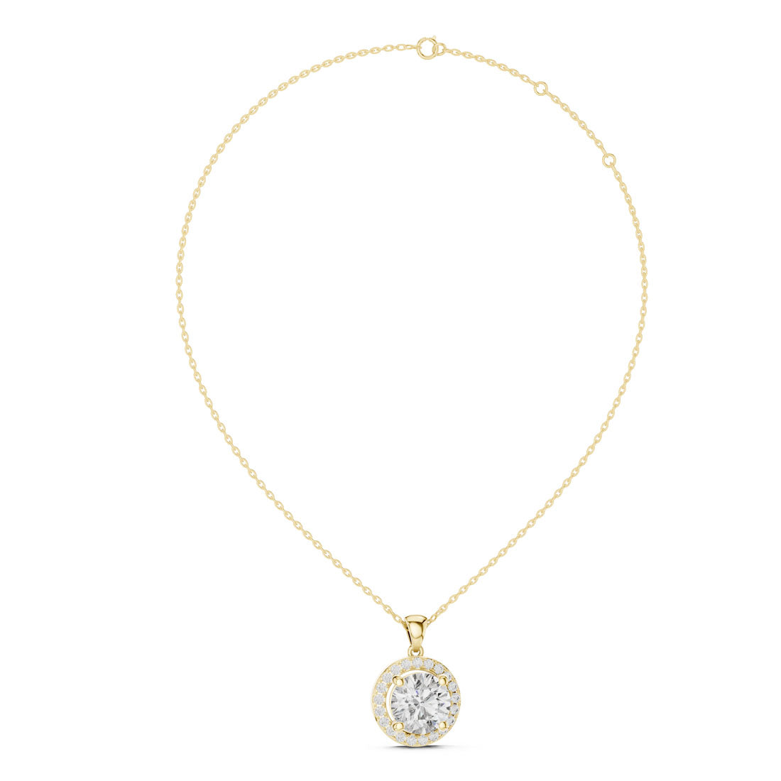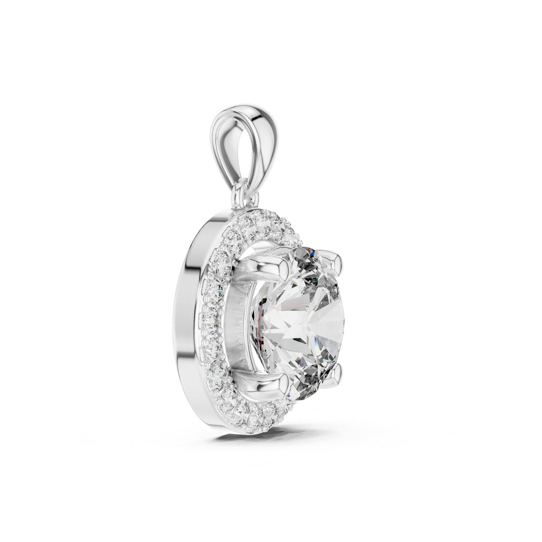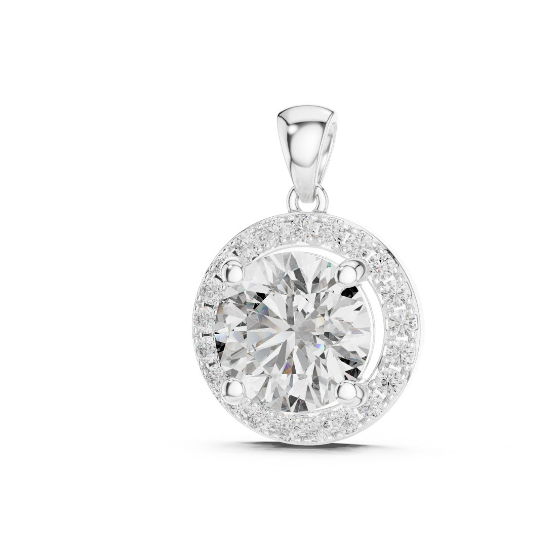 תליון יוקרתי בעיצוב עגול עם יהלום מרכזי קלאסי וסביבו מסגרת הילה נוצצת משובצת יהלומים נוספים